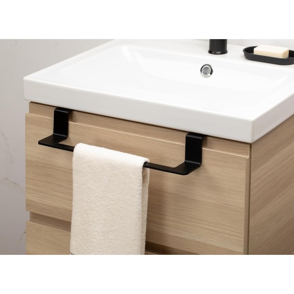 Práctico toallero que se coloca fácilmente sobre puertas o cajones del mueble sin necesidad de herramientas ni perforaciones. Fabricado en aluminio 100% inoxidable, resistente a la humedad y al óxido, garantizando durabilidad incluso con uso diario. Su diseño minimalista facilita la limpieza y aporta un toque moderno al baño. Medidas: 40 × 7 × 9,2 cm.