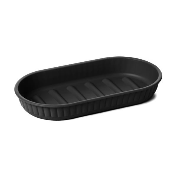 Jabonera de 15 x 8,2 x 2,1 cm, fabricada con materiales reciclados resistentes. Su diseño alargado con base acanalada facilita el drenaje del agua, ayudando a mantener el jabón seco y en mejores condiciones.