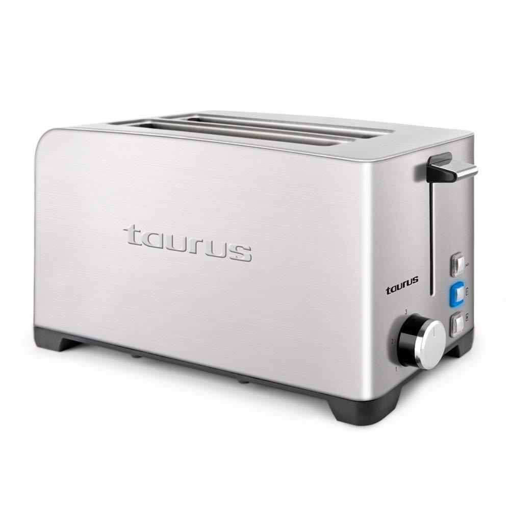 Tostador de acero inoxidable con dos ranuras extralargas de anchura variable. Tiene 3 funciones: Descongelar, recalentar y cancelar la cocción. Contiene bandeja recogemigas. Potencia 1400W