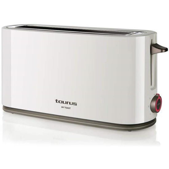 Tostador de Taurus de 1000W con ranura larga de 26 cm para todo tipo de pan. Elige el punto de tostado que mas te guste con sus 7 niveles . Bandeja recogemigas de fácil extracción.