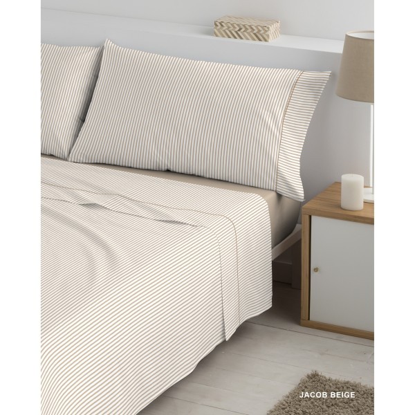 Juego de sábanas para cama de 105 cm confeccionado en tejido de tacto agradable en mezcla de algodón y poliéster, con diseño de finas rayas en tono beige que aporta un estilo elegante y atemporal al dormitorio, e incluye funda de almohada de 45x125 cm.