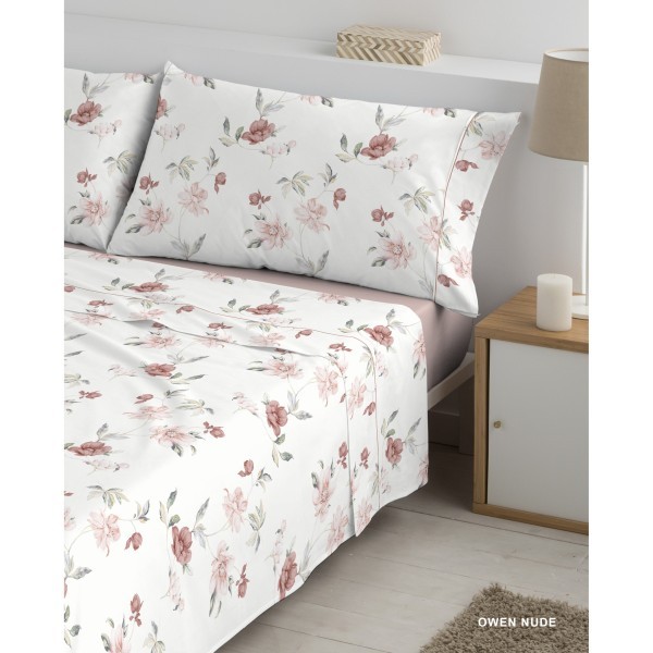 Juego de sábanas para cama de 135 cm confeccionado en tejido de tacto agradable en mezcla de algodón y poliéster, con delicado estampado floral en tonos nude sobre fondo claro, que aporta frescura y elegancia al dormitorio, e incluye funda de almohada de 45x155 cm.