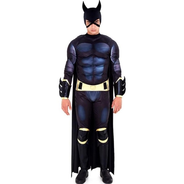 Conviértete en el superhéroe más icónico con este disfraz de Héroe Murciélago de la talla M. El conjunto incluye mono enterizo con cremallera y relleno de músculos, capa larga, cinturón efecto metalizado, brazaletes y rodilleras, cubrebotas y máscara de media cara.