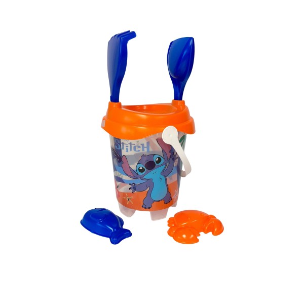 Divertido cubo de playa con diseño Stitch, perfecto para que los más pequeños construyan castillos y figuras en la arena mientras disfrutan del verano.