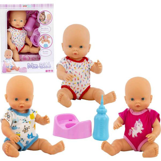 Muñeco de 35 cm con orinal y biberón sólo disponible en dos modelos (rosa y blanco-rojo). Edad recomendada +3 años.