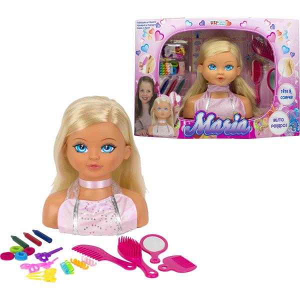 Busto muñeca Maria peinados con accesorios. Edad recomendada 3 años. Medida del busto 28 cm.