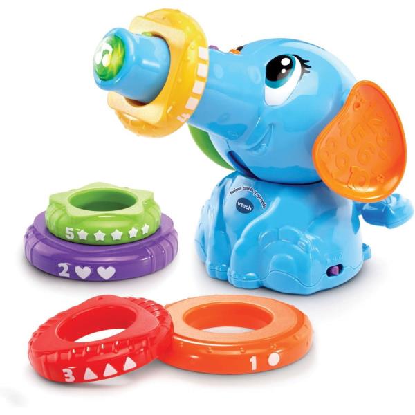 Descubre las canciones presionando el botón de su trompa y ordena los anillos por tamaños para aprender los colores, las formas y los números. Edad recomenada +12 meses.