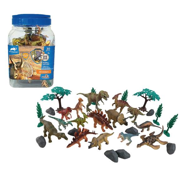 Bote con figuras de dinosaurios. Incluye 30 piezas. Edad recomendada +3 años.