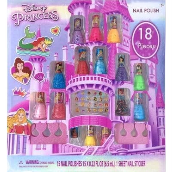 Un castillo lleno de color y magia. Este set de 18 piezas incluye 15 esmaltes de uñas con diseños de tus Princesas Disney favoritas y 1 hoja de pegatinas para decorar.