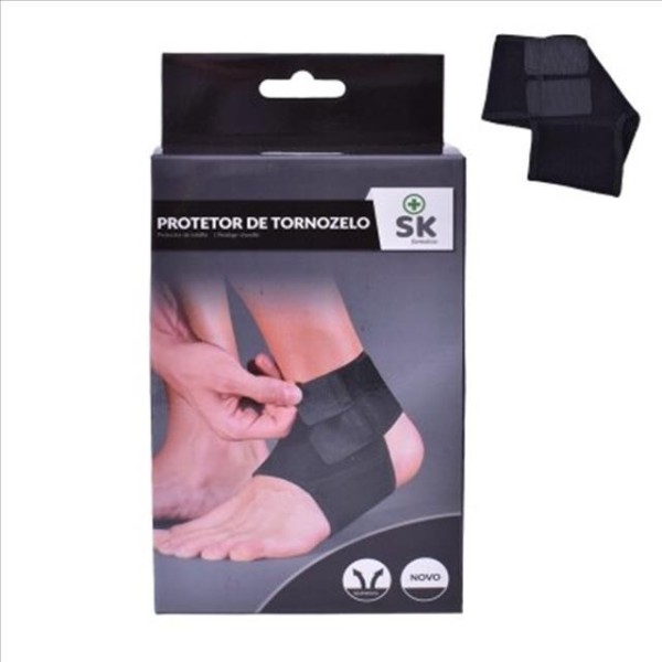 Protector de tobillo ajustable con sistema de cierre adherente, diseñado para ofrecer sujeción firme y cómoda durante la práctica deportiva o actividades diarias.