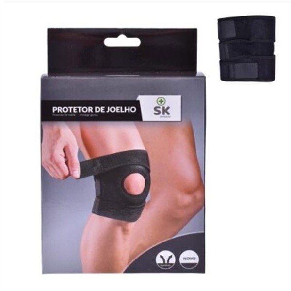 Protector de rodilla ajustable con refuerzo central y abertura para la rótula, diseñado para brindar mayor estabilidad y sujeción durante la actividad física.