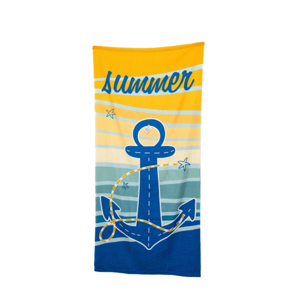 La toalla de playa 70 x 150 cm 250 gr es perfecta para disfrutar del verano con un estilo fresco y marinero. Su diseño con ancla central en azul, fondo degradado en tonos amarillos y azules y la palabra “Summer” en la parte superior transmite el auténtico espíritu náutico.