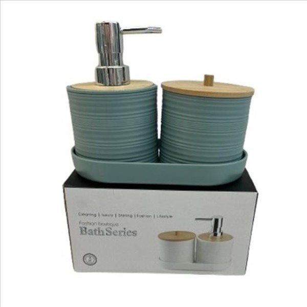 Set de baño elegante y funcional en acabado azul con detalles en bambú. Incluye dos piezas principales sobre bandeja a juego: dosificador de jabón y recipiente con tapa para almacenamiento.