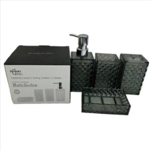 Set de baño con diseño geométrico texturizado, ideal para aportar un toque moderno y elegante al lavabo. Incluye dosificador de jabón con bomba metálica, vaso, portacepillos y jabonera, todo fabricado en material resistente.