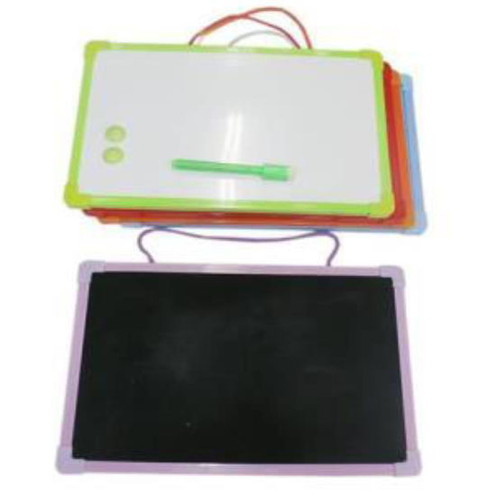 Pizarra magnética con doble cara para escritura con tizas y rotulador. Medidas: 40x30 cm. Marco de plástico en colores surtidos. Incluye un asa para colgar y rotulador. Medidas 40x30 cm.