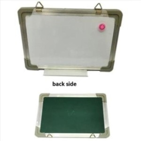 Pizarra magnética de doble cara para escritura con tizas y rotulador (incluido). Medidas: 40x60 cm. Incluye soportes para colgar.