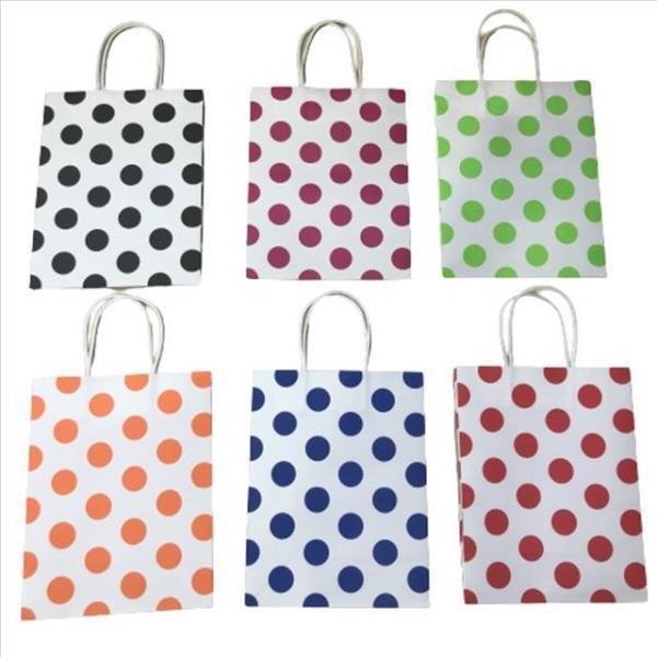 Bolsa de regalo kraft decorada con lunares. Disponible en varios colores (negro-fucsia-verde-naranja-azul-rojo), puede indicar el modelo deseado en el comentario del articulo. Medidas: 27x21x11 cm.