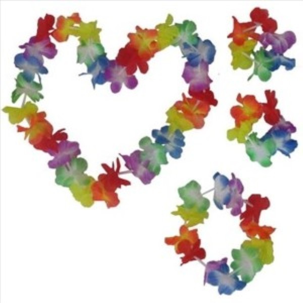 Conjunto hawaiano compuesto por un collar de flores, una diadema y dos pulseras.