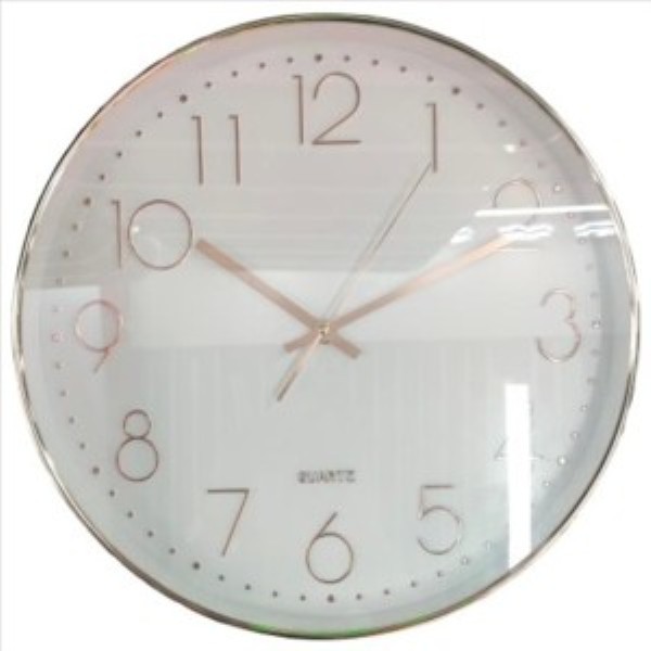 Reloj de pared de 35 x 4,3 cm fabricado en plástico, con un diseño elegante y atemporal. Su esfera blanca se combina con números y manecillas en tono dorado rosado, aportando un toque sofisticado a cualquier estancia.