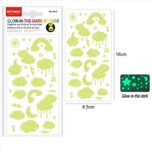 Ilumina la habitación o tus proyectos creativos con este encantador set de pegatinas que brillan en la oscuridad. Incluye lunas, nubes, estrellas y pequeños elementos decorativos que cargan con la luz y resplandecen suavemente cuando cae la noche.
