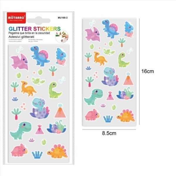 Dale un toque jurásico y lleno de color a tus manualidades con este adorable set de pegatinas glitter de dinosaurios.