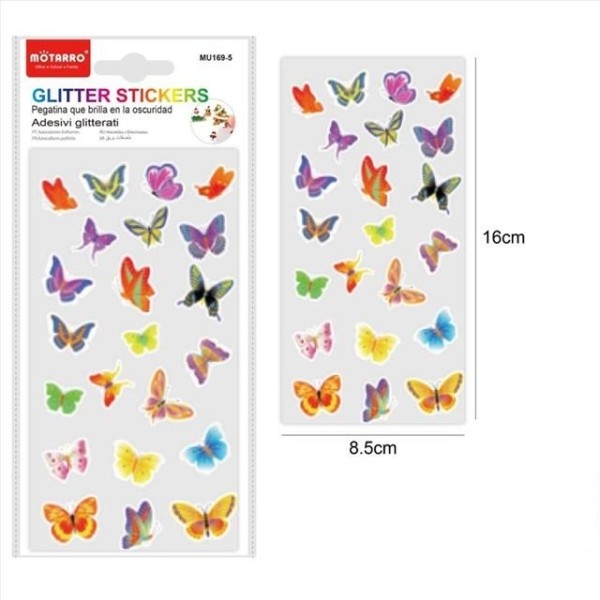 Decora con un toque de magia gracias a este precioso set de pegatinas glitter de mariposas multicolor.