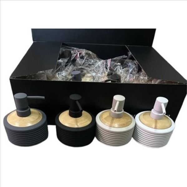 Dosificador de 10,5 x 12 cm, fabricado en ABS resistente con detalle efecto madera. Diseño compacto y actual, ideal para jabón o gel. Aporta un toque natural y moderno al baño. Disponible en varios colores.