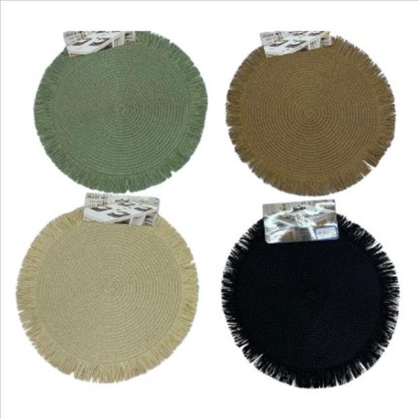 Salvamantel de 38 cm de diámetro, ideal para proteger la mesa con un toque natural y decorativo. Fabricado en material resistente, con acabado trenzado y flecos. Disponible en 4 colores surtidos.