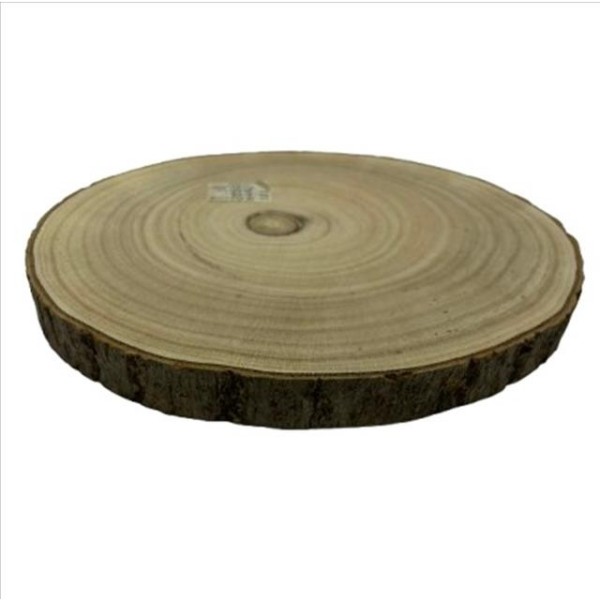 Base decorativa redonda fabricada en madera natural, con un grosor de 20 mm y un diámetro aproximado de 20-22 cm.