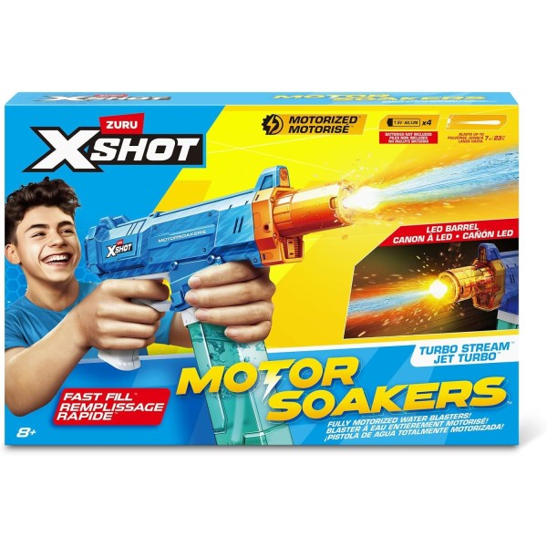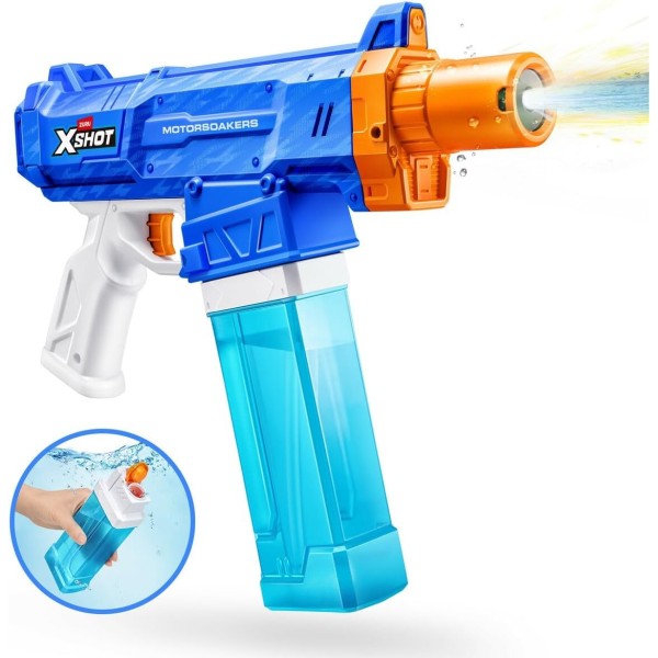 Potente pistola de agua motorizada que dispara chorros continuos con gran alcance y efecto de luz en el cañón. Su sistema de recarga rápida y depósito de 300 ml permite jugar sin interrupciones y dominar cualquier batalla acuática. A partir de 8 años.